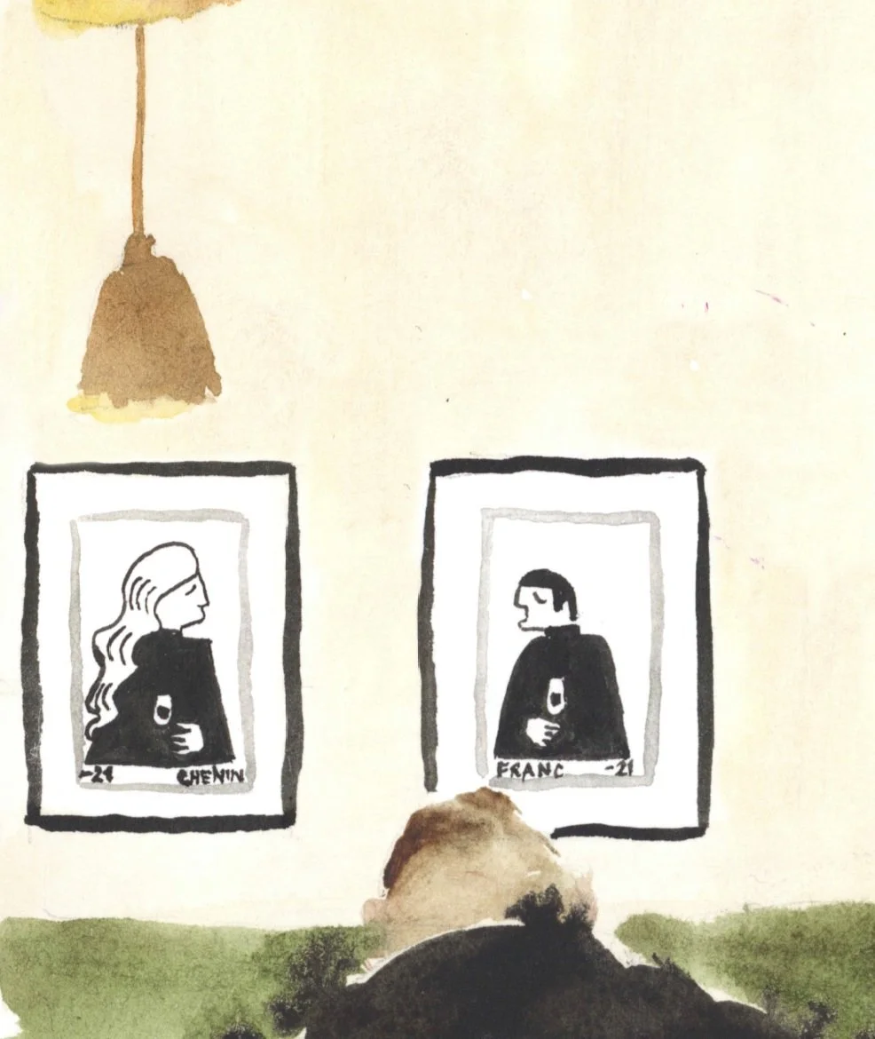 All the while, our two printed friends, Franc and Chenin, in their individual picture frames, watch over endless conversations with the same never-ending glass of wine perched in each of their hands. I find myself almost envious of them. I wonder what their own conversation is about? I wonder how many secrets they know? They don’t look like gossipers, more like the type to share a knowing look with one another and never mention it again.
