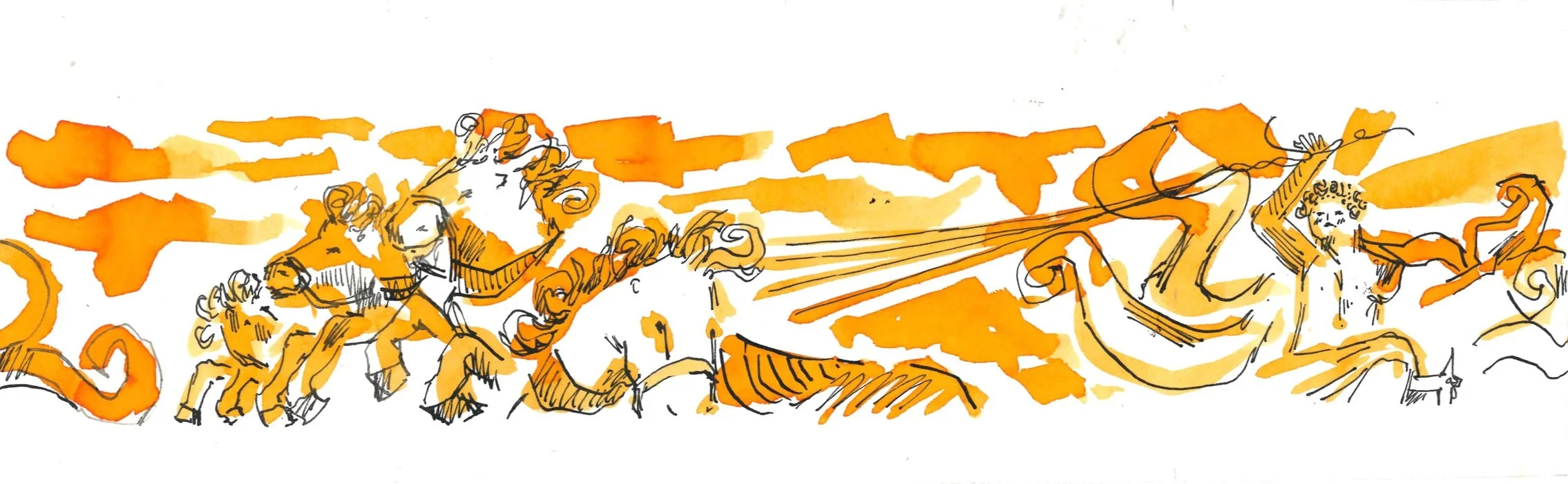 Helios who pulls the sun across the sky in his golden chariot, East to West every day. One myth tells that Helios is the one who informed Hephaestus of Aphrodite’s affair with Ares.